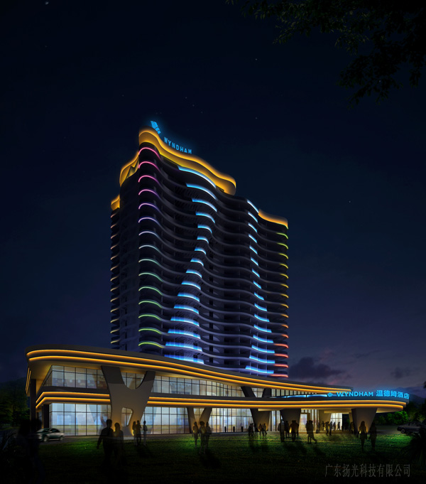 在財富廣場的燈光設計中我們傳達的是"輕松,溫馨與愉悅"的設計主題.展示寫字樓特有的氛圍,體現東莞城市的開拓,創新精神的燈光意境.財富廣場獨特的地理位置和影響力,在設計上,我們把主樓區,樓頂,群樓商業區域之間,形成高,中,低三個層次的整體燈光效果.