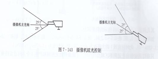 c. 嚴格控制對攝像機的眩光。即不得向主攝像機視野反射靜水表面的光,燈具發出的光線也不得直接投向固定攝像機。如不直接照射以固定攝像機為中心的50°扇形區域則更為理想。如圖7-143