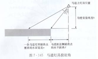 電視轉播不僅要求有水平照度,還要求有4個方向的垂直照度。同時為保證拍攝畫面的立體感,水平照度與垂直照度之比Eh/Ev應在0.5-2之間。以圖7-145為例,燈具近側瞄準點的投射角α1不宜太小,而遠側瞄準點的投射角α2又不宜太大。如果投射角α1太小,則垂直照度分量太小,不能滿足Eh/Ev 的比例要求,如果投射角α2太大,則會產生嚴重眩光。