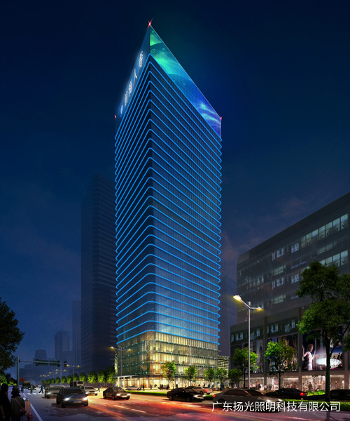 根據對建筑主體的解析,頂部在西北面設置LED顯示屏,東南面設置企業LOGO來增強建筑的標識度,立面采用燈管色勒,有效的表現出建筑龍骨結構的層次感,通過線條變化體現出城市高效發展的速度。